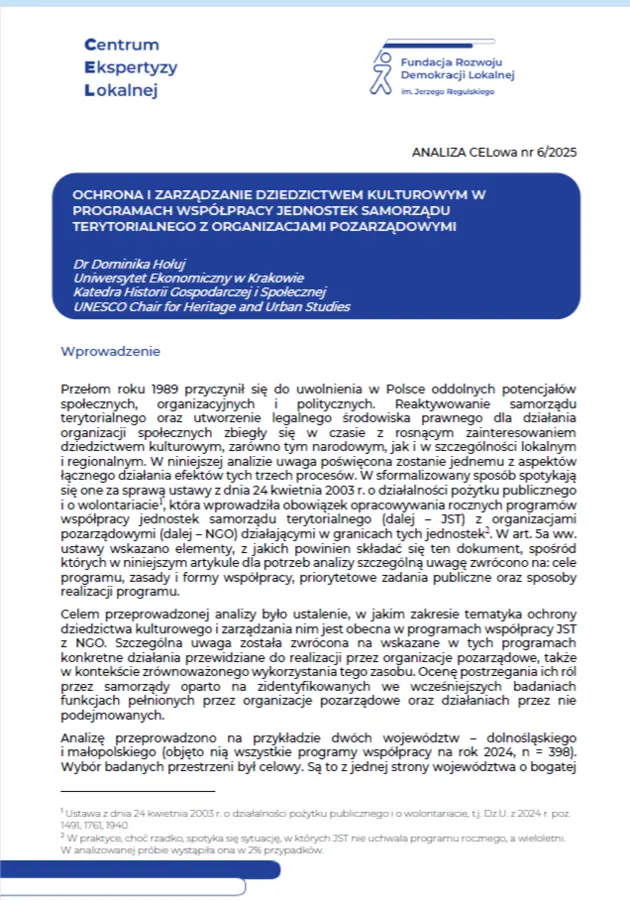 Przedmiot analizy stanowi ujmowanie w programach współpracy JST i NGO kwestii ochrony dziedzictwa kulturowego i zarządzania nim. Badaniem objęto województwa małopolskie i dolnośląskie. Jego celem było ustalenie, w jakim zakresie ta tematyka jest obecna w programach współpracy oraz jakie funkcje organizacji pozarządowych są w nich dostrzegane. Analiza potwierdziła z jednej strony powszechność rozpoznawania NGO jako podmiotów realizujących zadania z zakresu kultury i dziedzictwa kulturowego. Z drugiej jednak strony uwidoczniła dość ograniczone postrzeganie katalogu funkcji NGO i problem schematyczności i ogólnikowości programów.